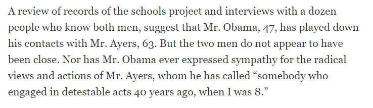 事实上,如果仔细阅读被佩林作为武器在竞选中攻击奥巴马的《奥巴马与60年代的爆炸者》,可以发现,这篇文章并未提出任何关于奥巴马同艾尔斯保持特殊关系的证据。恰恰相反,在作者的叙述中,“二人看起来并不亲密”。“奥巴马先生没有表达过对激进观点和艾尔斯先生行为的同情。”