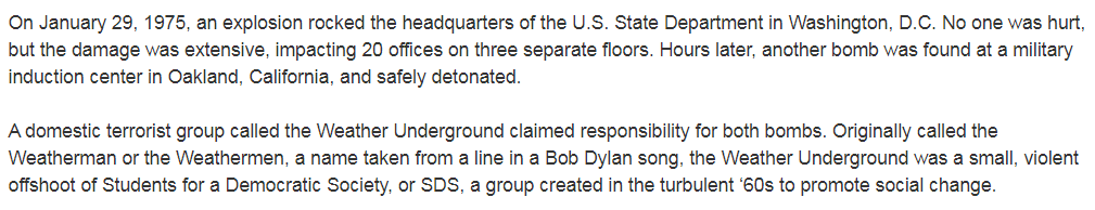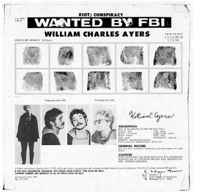 《大英百科全书》(Encyclopedia Britannica)词条显示,比尔·艾尔斯(Bill Ayers)是“地下气象员”(Weather Underground)组织的联合创始人和最高领导人之一。“地下气象员”是一个活跃于上世纪60至70年代的激进左翼暴力极端组织,最初宗旨是反越战。美国联邦调查局(FBI)网站显示,该组织曾轰炸全美境内多座政府大楼和机构,该组织也因此被定性为“国内恐怖主义组织”。