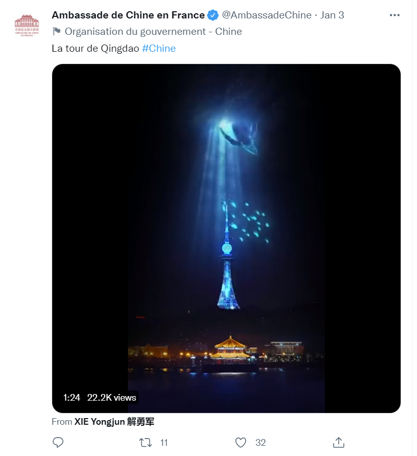 使用InVid分析工具对相关视频进行关键帧提取,再经图片反搜后则可以发现,该视频曾在1月3日被推特认证用户“中国驻法国大使馆”(@Ambassade de Chine en France)转发,配文使用的是法文“青岛之塔”(La Tour de Qingdao)。