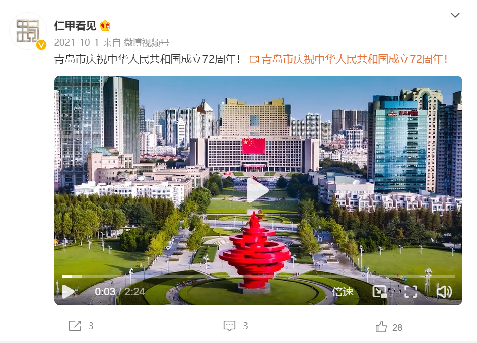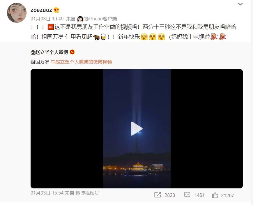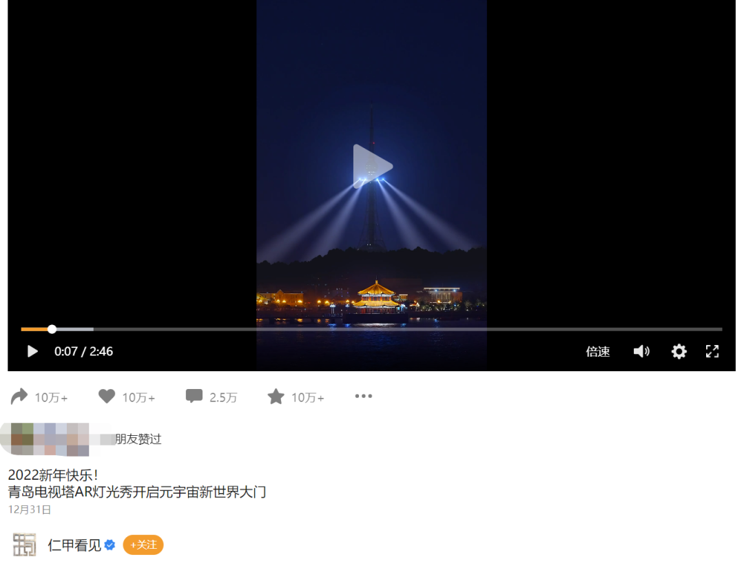 “仁甲看见”的微信视频号则在12月31日当日发布了名为《2022新年快乐!青岛电视塔AR灯光秀开启元宇宙新世界大门》的视频,截至发稿当日,该视频的播放量已达“10万+”。此外,“仁甲看见”的微信公众号还在1月3日发布了一篇题为《外交部发言人点赞青岛AR灯光秀》的文章,对@赵立坚个人微博转发相关视频表示了感恩,并称“我们的时代到来了”。