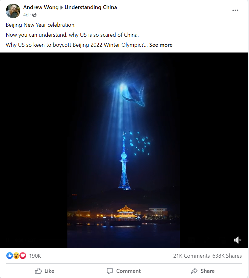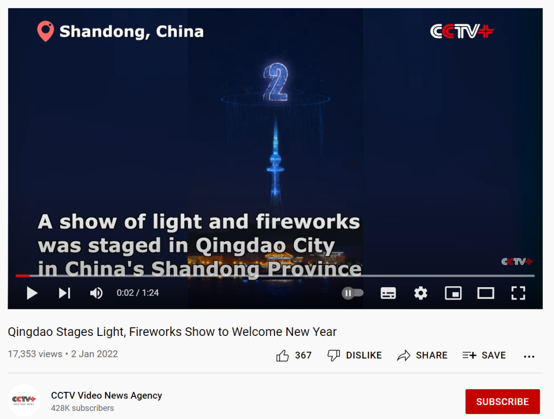 2022年1月2日,订阅者数达42.8万名的“CCTV视频新闻机构”(CCTV Video News Agency)频道在YouTube上传了网传视频的加速编辑版本,并配上了说明文字。根据该说明文字,这段拍摄于中国山东的视频展示的是一场在青岛筹划的跨年灯光、烟火秀,这一说法与脸书用户声称的 “北京新年庆祝活动”矛盾。