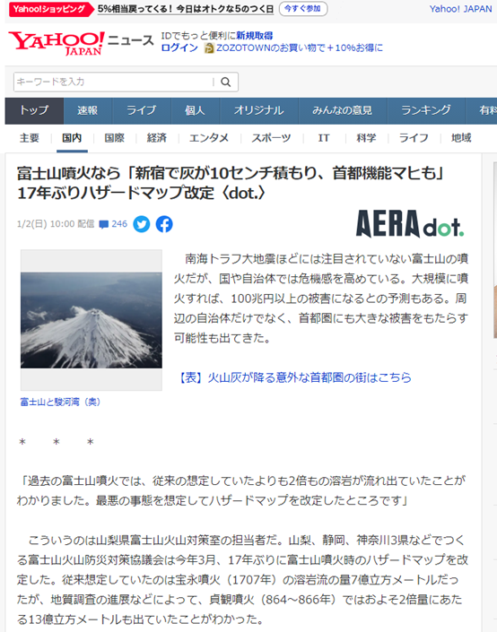 在当下,尽管现有技术无法准确预测富士山何时会下一次喷发,但日本媒体对于富士山的喷发可能性、特别是对喷发带来的影响,已经形成了“常态化报道+常态化预防” 模式。比如NHK(日本广播协会)近期就制作了不少关于“一旦富士山喷发,会产生何种影响”的节目;1月2日,Yahoo! JAPAN(雅虎日本)又刊文警告称,一旦富士山喷发,其带来的总损失将比日本政府估计的更高。