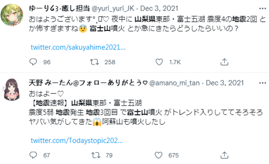 推特内容显示日本民众将山梨县、和歌县地震与富士山喷发联系在一起。