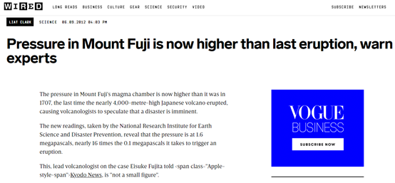英国科技门户类网站WIRED和澳洲广播公司(ABC)曾在2012年9月6日报道称,据日本国立防灾科学技术研究所(NIED)专家报告,日本富士山当时的内部压力预估已在1.6兆帕左右,相当于把15.8公斤每平方厘米的气压存储在岩浆房(magma chamber)内。