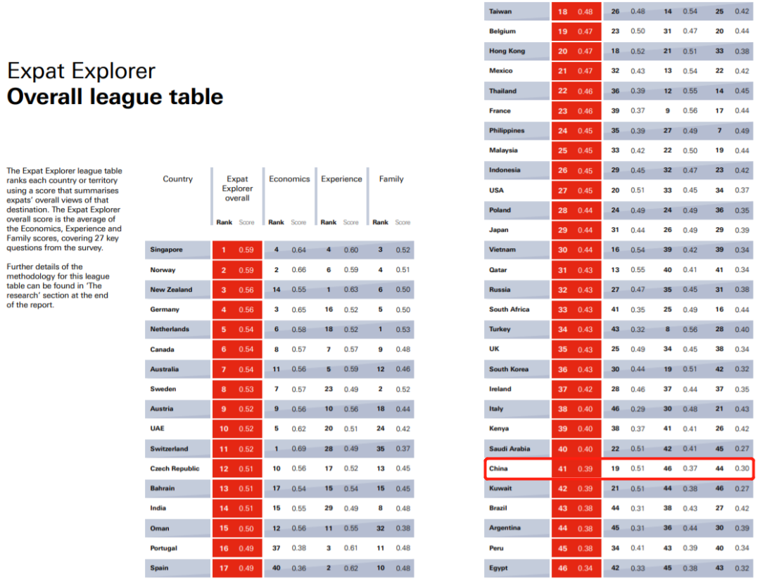 2017年,汇丰银行(HSBC)基于YouGov网站2017年3月至4月面向各国外籍人士对所在地态度进行的网络调查,综合经济(economics)、经历(experience)和家庭(family)三项指标,发布“最适合外国人居住”的国家和地区排行。中国大陆位列第41名。