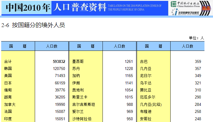 第七次全国人口普查结果显示,2020年居住在我国的外籍人员达到约84.57万,相比2010年增加了将近25万。尽管如此,中国仍旧是世界上“国际移民”占总人口比重世界最低的国家之一。