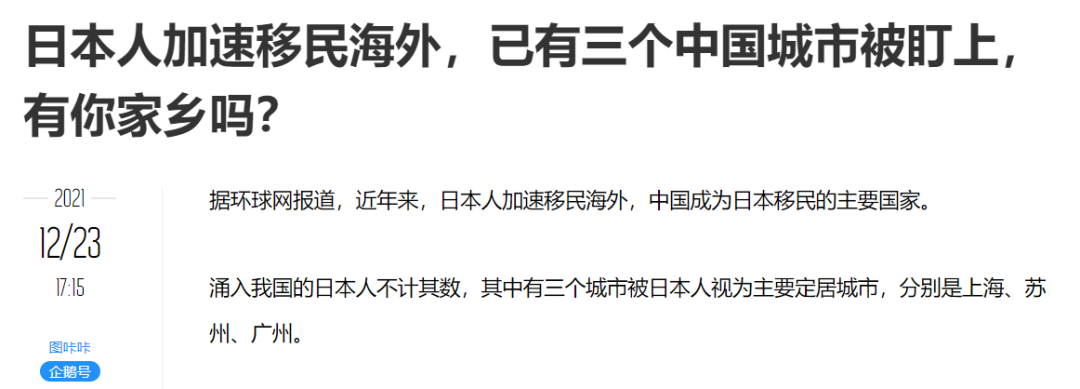 有自媒体账号称,近年来,日本人加速移民海外,中国成为日本移民的主要国家。而上海、苏州、广州是在华日本人定居的三大目标城市。