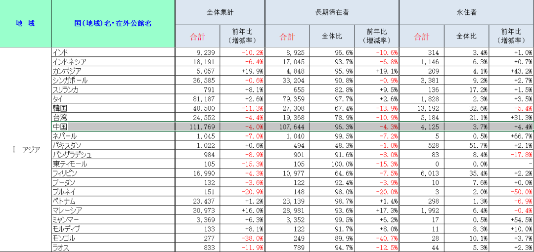 亚洲各国“长期滞留”和“永居”人数统计。按照外务省的说法,台湾方面的调查被委托给日本台湾交流协会,单列一行。