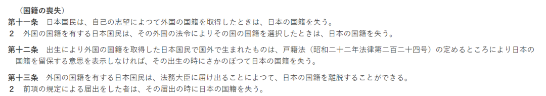 日本法务省网站《国籍法》第十一条至第十三条关于“丧失日本国籍”的说明