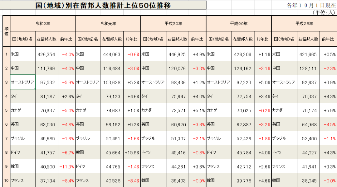 2021年10月,日本外务省发布《海外日籍人数调查统计(令和3年版)》(Annual Report of Statistics on Japanese Nationals Overseas),汇总了2020年10月1日至2021年10月1日的数据。