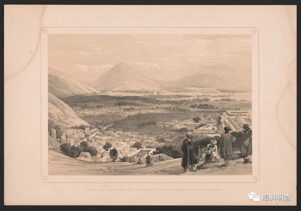 詹姆斯·阿特金森 (James Atkinson)创作的石版画《从城堡上方俯瞰巴拉希萨尔和喀布尔城》,1842 年在伦敦出版。