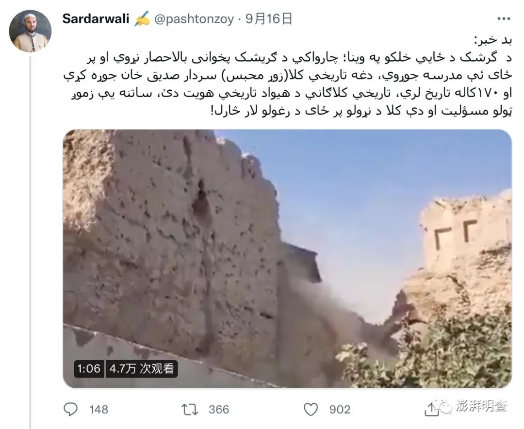 值得注意的是,就在9月16日当天,@pashtonzoy便更新了事件后续:“塔利班已经停止摧毁该堡垒,将努力展开修复工作。”9月21日,同样关注该事件的推特用户@Natsecjeff援引塔利班消息人士的说法称,摧毁巴拉希萨尔城堡一事是假新闻,塔利班当局派人探访了该地,并放出了一些新拍的照片。