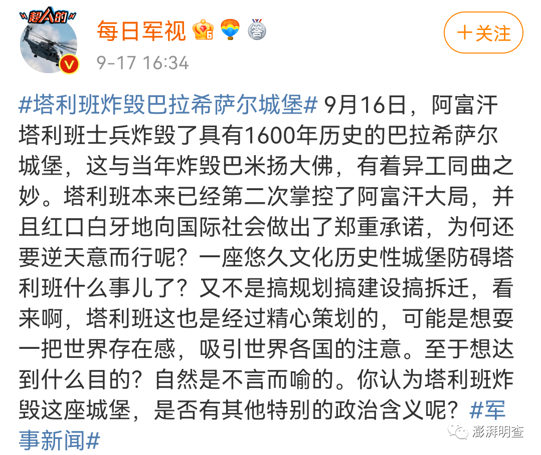 近日,在今日头条、微博等中文社交媒体网络上流传的一则消息称,阿富汗塔利班士兵于9月16日炸毁了具有1600年历史的巴拉希萨尔城堡。