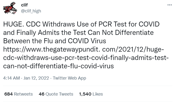 近日,有网友@clif_high发推称,美国疾控中心(CDC)承认新冠检测不能区分流感和新冠病毒,并回撤核酸检测包。此条推文获得千余点赞和转发。