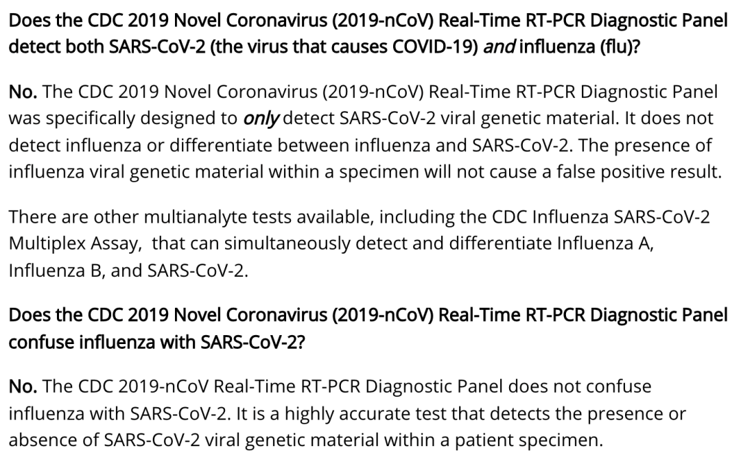 “承认新冠检测不能区分流感和新冠病毒,因此回撤核酸检测包”为假新闻。美国疾控中心已经澄清,停用核酸检测是为推行新冠和流感多重测定法,以节约时间和资源。