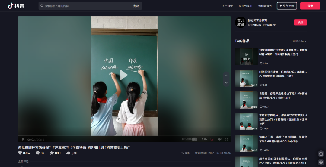 2021年5月3日,抖音用户“陈老师育儿教育”在平台上传了一段名为《你觉得哪种方法好呢?》的视频。经比对,该视频和推特上流传视频系同一视频,只不过,“陈老师育儿教育”发布的视频中将“中国”和“印度”标签直接写在了黑板上,而推特视频则将中文字符用白色背景框遮住并换成了英文。