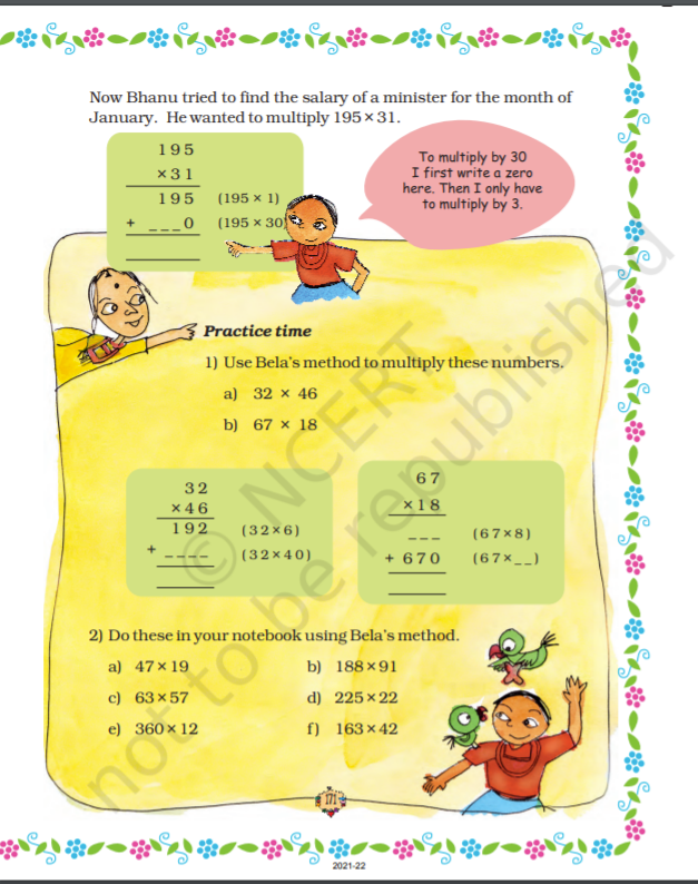 NCERT数学教材第5级,第13章《乘除的方法》,教授了乘法的竖式解法。