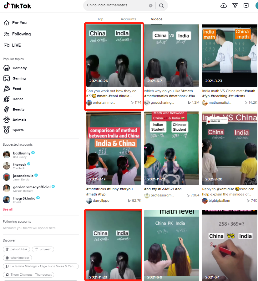 推特上流传的视频画面中带有明显的Tiktok@74bam128水印,疑似视频的来源,但搜索@74bam128账号发现,原号已不可寻。不过,对“中国 印度 数学”关键词检索的结果显示,这一视频至少从去年10月起就已经在TikTok平台上流传。
