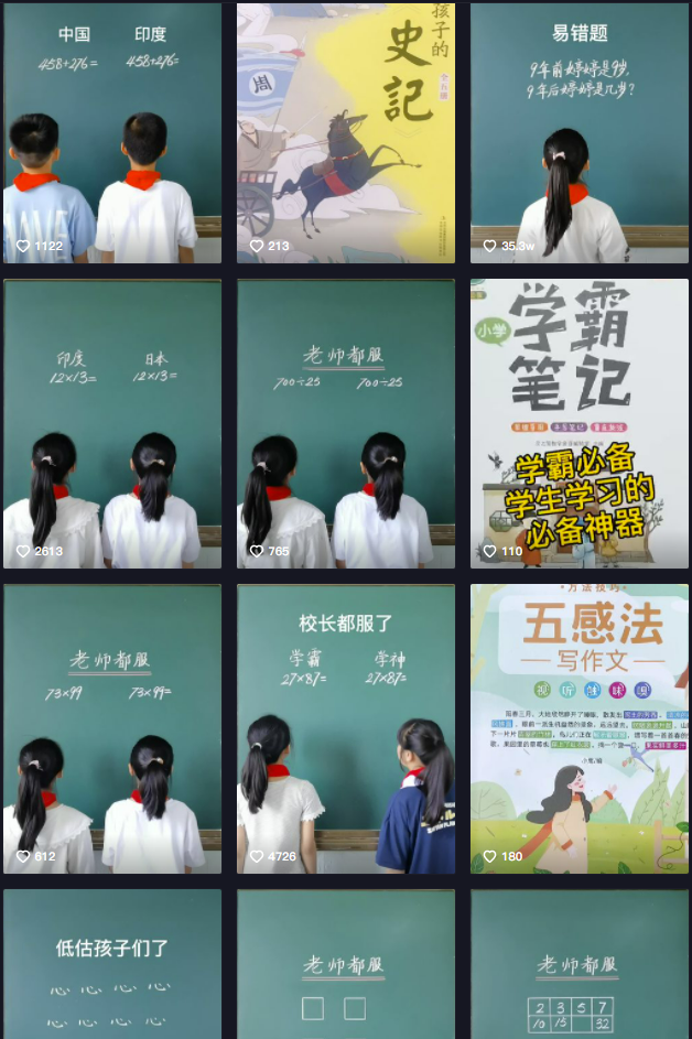 使用InVid软件对视频的关键帧进行提取并置于“百度识图”中反向搜索后,可以发现,视频右侧穿着白色上衣和粉色灯笼裙的女孩造型曾在微信视频号、抖音、TikTok、新浪小视频等多个“短视频”平台中出现。这些视频包含一系列相似的元素,如写着题目的黑板、背对观众的小学生、学生用粉笔在黑板上解题等。