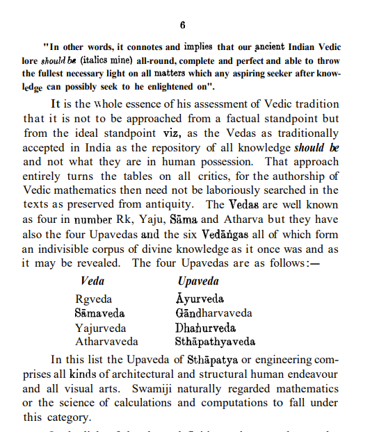 作为《吠陀数学》的总编,艾格拉瓦拉在书本前言部分就已经澄清,蒂尔萨所说的“吠陀”不是一个事实概念,而是理想中的概念。蒂尔萨认为, “吠陀”一词的本义是“知识”,意味着人类所需的一切知识,包括精神层面和世俗层面。