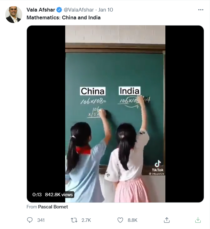 近日,推特上流传一段视频,号称是中国和印度孩子数学解题方法的对比。