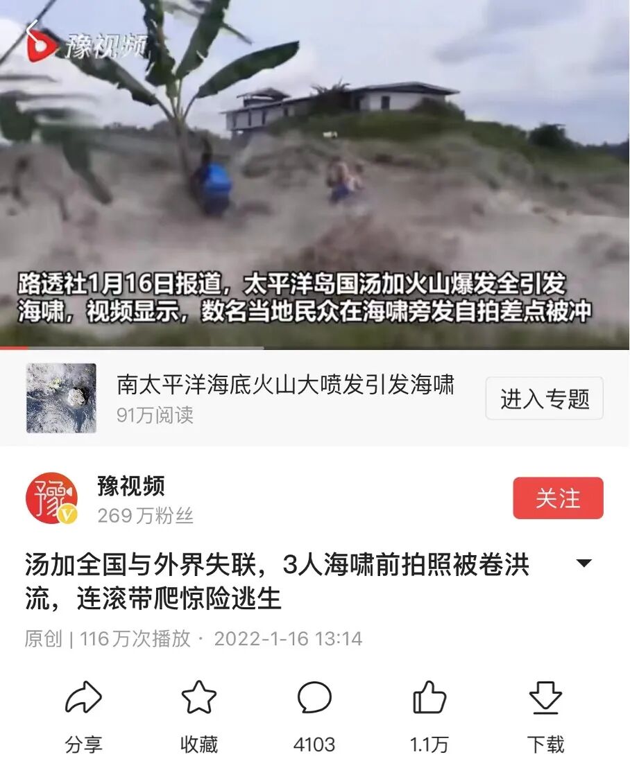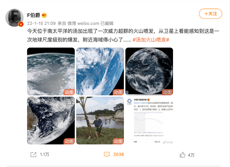 1月15日,有微博网友在探讨有关汤加火山爆发有关内容时,上传了一张某男子练习打拳的动图。该男子身着蓝色救生马甲,用力击打一棵阔叶树木。男子身后,有巨浪逼近,三人奋力奔向岸边,但被冲走,其中有两人手持自拍杆,似乎正在进行一场拍摄。