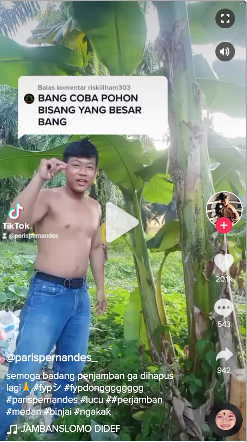 去年8月,一名为@parispernandes_的Tiktok用户上传了一则极具感染力的短视频。在视频中,他一边大力击打香蕉树,一边喊着“民礼的问候”。“民礼的问候”因此迅速走红,成为现象级网络热梗,受到网友模仿和媒体争相报道。来自苏门答腊岛民礼市的@parispernandes_也一跃成为一名拥有220万粉丝的超级网红。