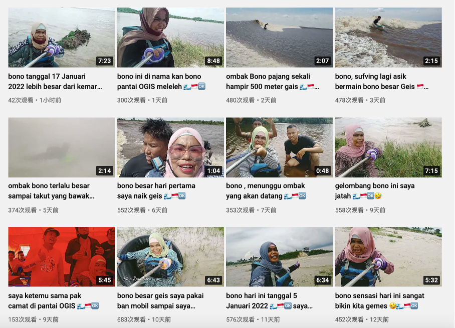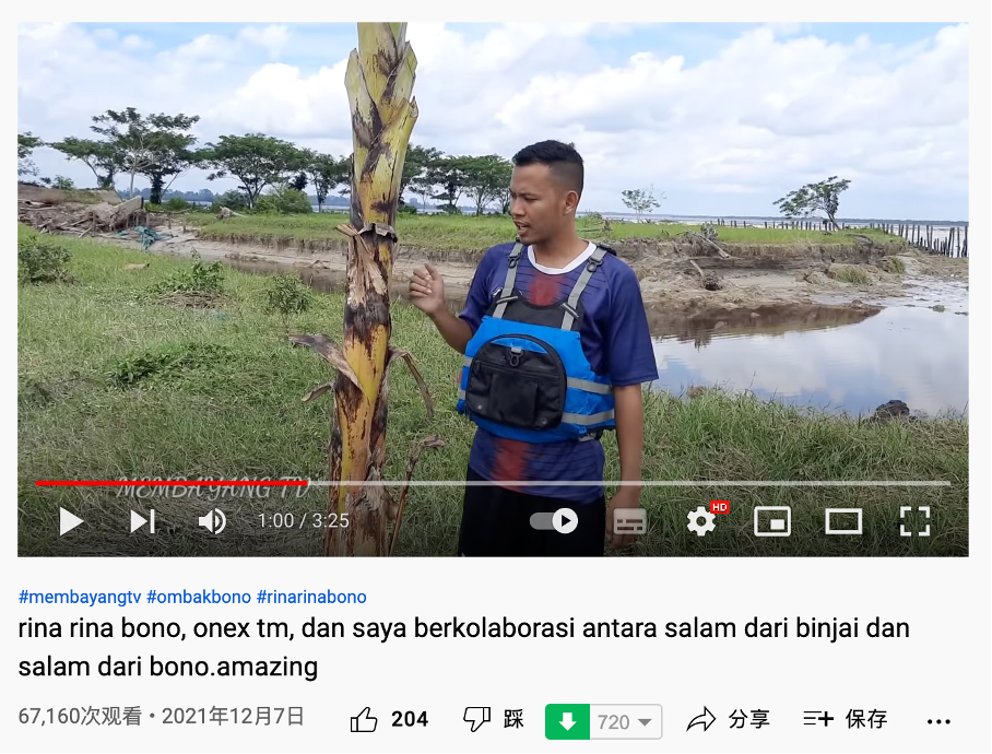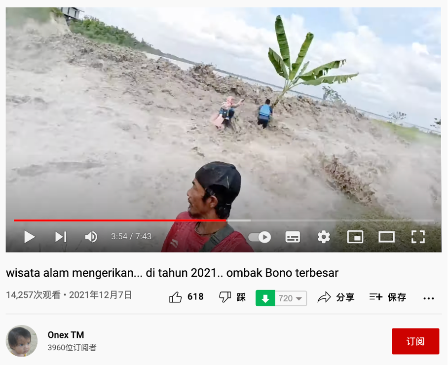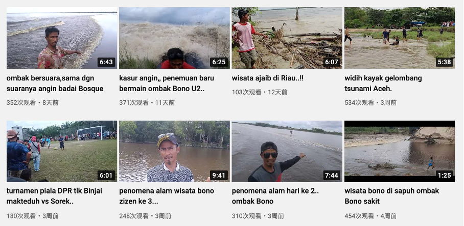 观察三位博主的视频后发现,三人创作风格十分相似,都包含大量海边自拍视角,且拍摄题材多围绕一种被当地人称为“bono”的潮汐波(tidal bore)现象。综合往期视频简介等公开信息推断,这三名YouTube博主均位于印度尼西亚廖内省(Riau)柏拉拉万县(Pelalawan Regency),拍摄地为金宝河(Kampar River)的入海口梅兰蒂湾(Teluk Meranti)。