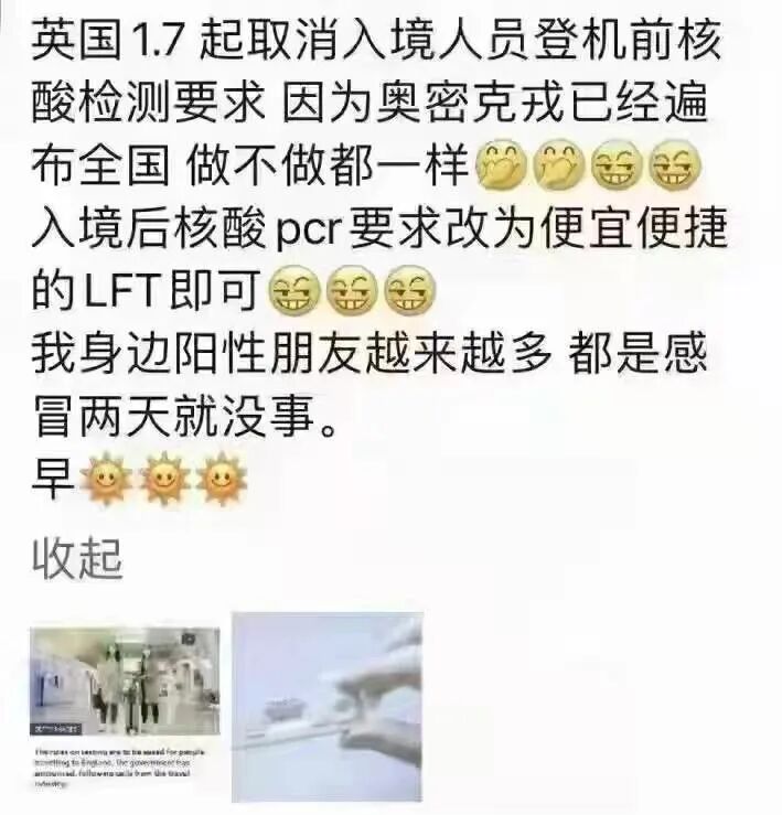 近来,微信群中流传一张截图,称“英国1月7日起取消入境人员登机前核酸检测要求,因为奥密克戎已经遍布全国,做不做都一样”,“入境后核酸PCR要求改为便宜便捷的LFT即可”。