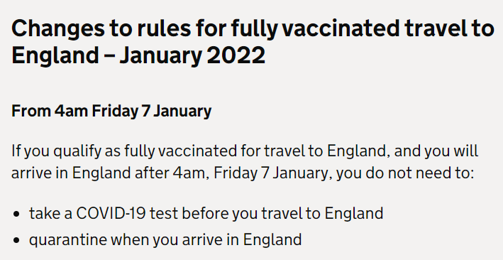 用互联网档案馆(wayback machine)查看1月7日之前的政府规定,可以发现,网传消息的确有迹可循。1月5日,英国政府(gov.uk)网页显示,“如果你有资格前往英格兰,并且将在1月7日星期五凌晨4点之后抵达英格兰,则您不需要:在前往英格兰之前进行新冠检测;在到达英格兰之后进行隔离。”