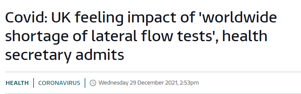 itv报道标题截图:“新冠:卫生秘书承认道,英国感到‘世界范围内横向流动检测短缺’的影响”