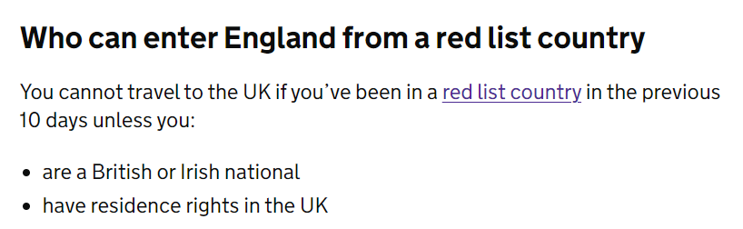 只有(a)英国/爱尔兰公民,或(b)有英国居留权的人才能从“红名单”国家入境英国四地