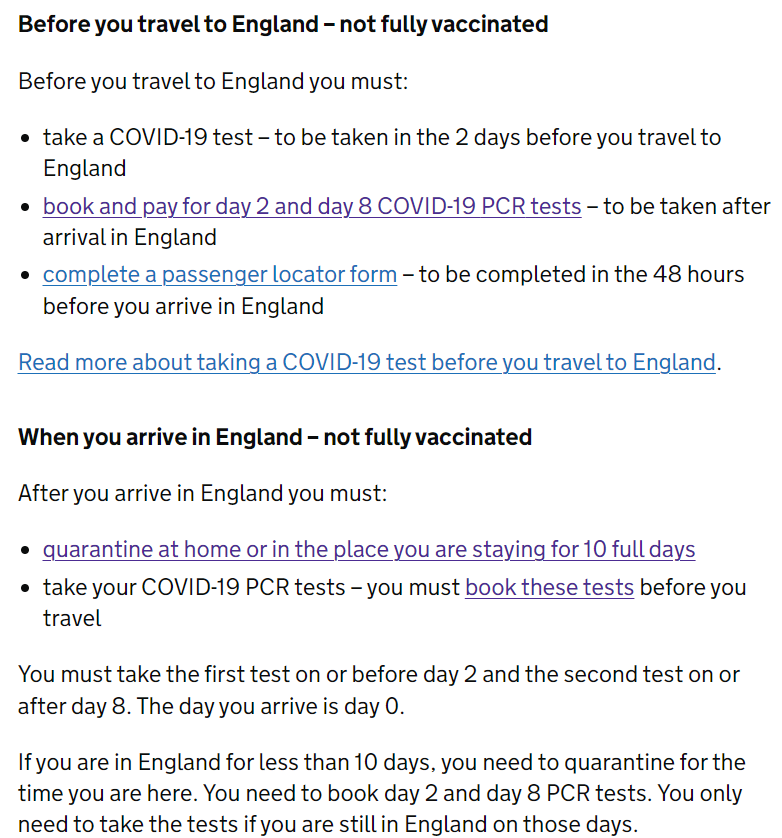 没有完成疫苗接种的旅客,在飞行前仍然会被要求提供阴性的检测报告,且入境后也会被置于更加严格的管理之下。这一点不论在英格兰、苏格兰、威尔士,抑或北爱尔兰,都是一样的。以英格兰为例,未接种疫苗的旅客在入境前和入境后都需要接受比横向流动更复杂也更灵敏的核酸测试。