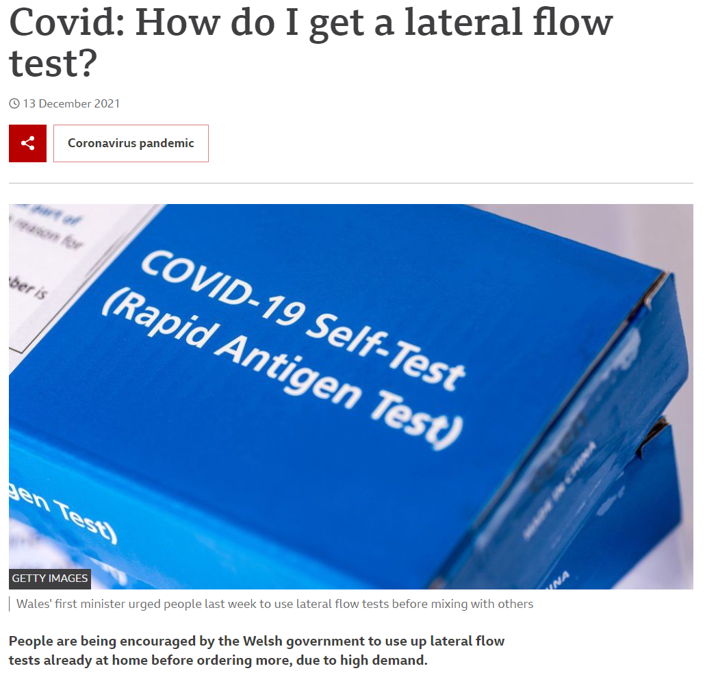 去年12月13日,英国广播公司(BBC)一篇报道称,一些在网上订购了横向流动测试的用户试剂已经售空。该文援引卡迪夫“湖边药房”(Lakeside Pharmacy)药剂师苏蒂尔·赛拉瓦特(Sudhir Sehrawat)的话说,有些药房受到限制,一天只能订购54个检测试剂,“但54个试剂一个小时就卖完了”。“由于需求量大,威尔士政府鼓励人们在订购更多之前用完家中已有的横向流动检测包。“