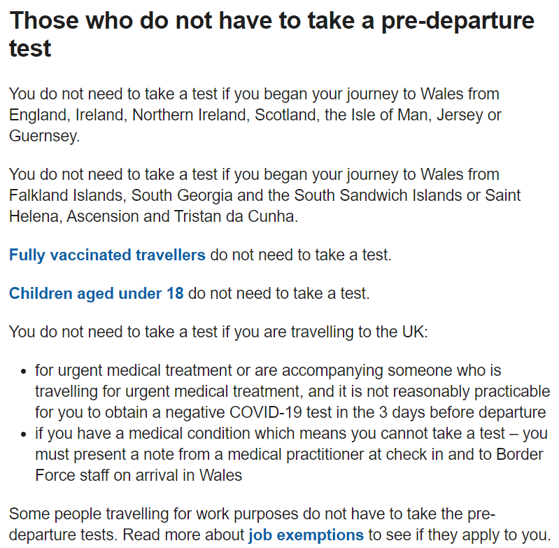 威尔士政府对免除行前检测的要求说明,旅客必须满足其中一项条件:(a)来自英国境内或英属海外领地,(b)完全接种疫苗,(c)未满18岁,(d)有医疗方面的特殊情况,或(e)从事某些特殊职业。