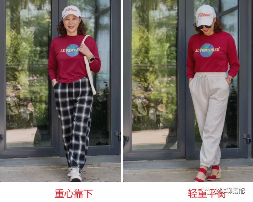 其实两套搭配在外观上的廓形都差不多,主要的差异在于裤子的花色。因为两条裤子的裤管都比较宽松,所以颜色更沉重的黑色会将重心往下拉,加上上衣也是体积感较重的酒红色,左图搭配就是“重+重”的组合,作为整体来看自然是右边的造型的“重+轻”能满足平衡的要求。
