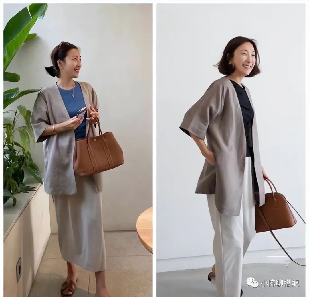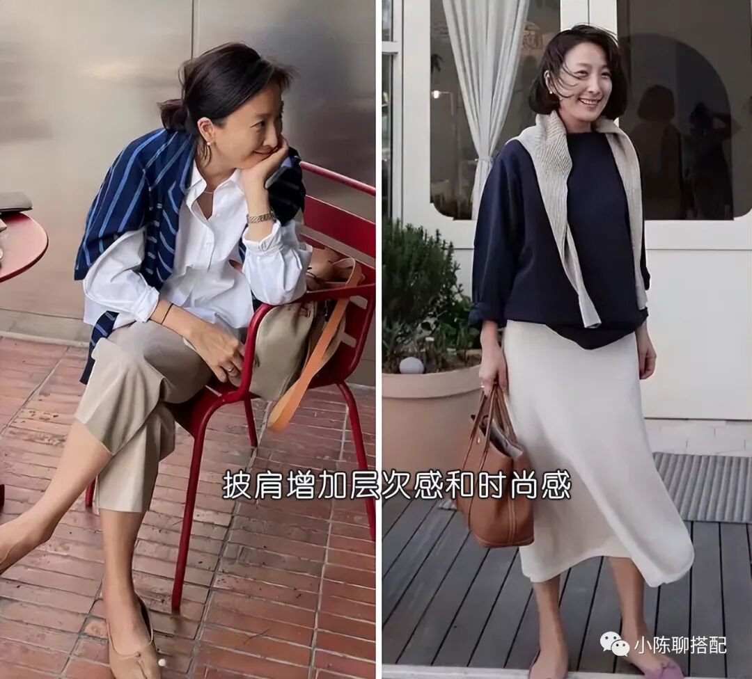 越是简约的穿搭越越需要细节点缀,除了色彩之外,像配饰、穿搭细节等都可以用上。这些细节能让穿着更加精致时尚,比如说这两身基础的穿搭,利用一件针织衫披在肩膀处,既增加层次感也让穿着更加随意。在夏季这样的一件披肩也不可或缺,尤其是在空调房中还可以御寒。