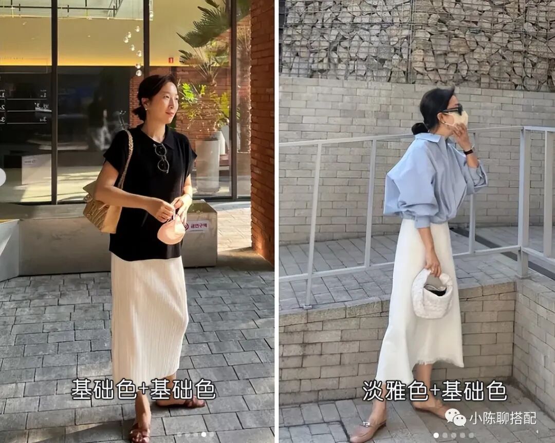 除此之外,色彩在搭配上也有所讲究,除了一个色彩原则之外,还需要结合身形来选择。若你是上半身纤细的身形,那么就选择上鲜艳下基础的搭配方式;而若你是上半身胖或全身微胖的身形,那么上基础下鲜艳就很适合了,且要注意下鲜艳的服装选择包容性更强的半身裙会更显瘦。