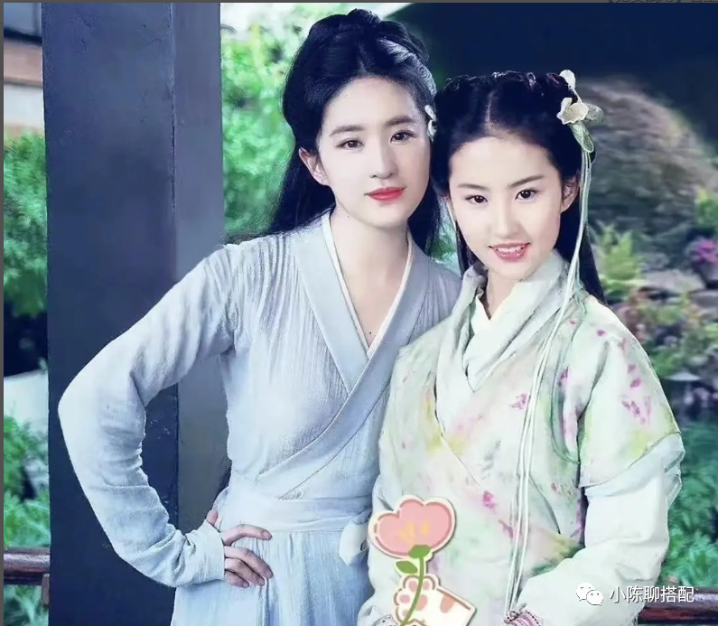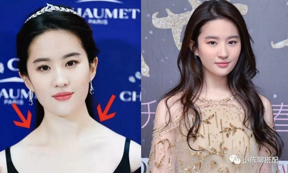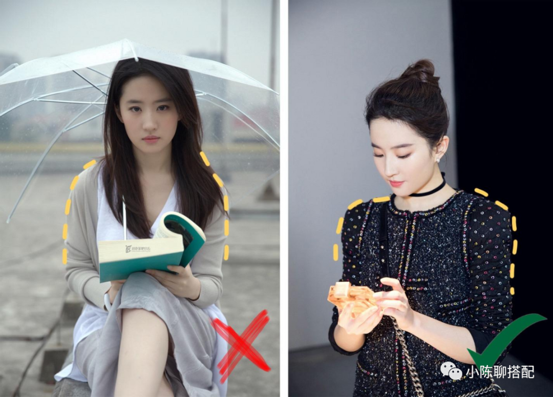 在塑形以外,日常通过穿衣搭配的方式就可以快速地修饰身形,还是拿神仙姐姐刘亦菲做例子,下图中的她穿上不同材质的衣服就能够呈现出完全不一样的肩膀形状出来。