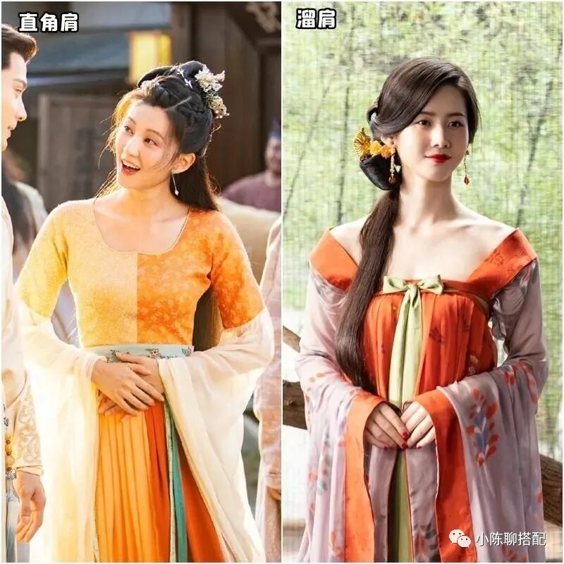 其中一个最大的因素就在于:古时的服装大多是一片式的剪裁,肩膀与袖子之间为一整片,没有缝剪痕迹,溜肩才能穿出古典柔美但又很大气之感,而直角肩反而会显出一种男相的粗壮、呆滞感,与飘逸灵动的服装对比起来非常违和。▼