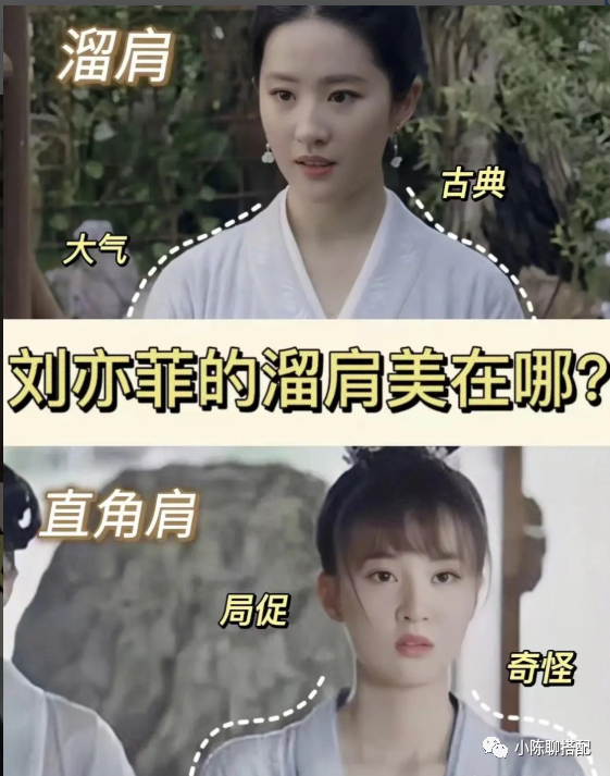 倒是现在大部分人所追求的直角肩成为了审美的主流,并以此来打压溜肩,但是直角肩与溜肩就一定必须有一个占据审美高位吗,那倒未必,尤其是被诟病的刘亦菲的溜肩其实更强调了她独一无二的美。