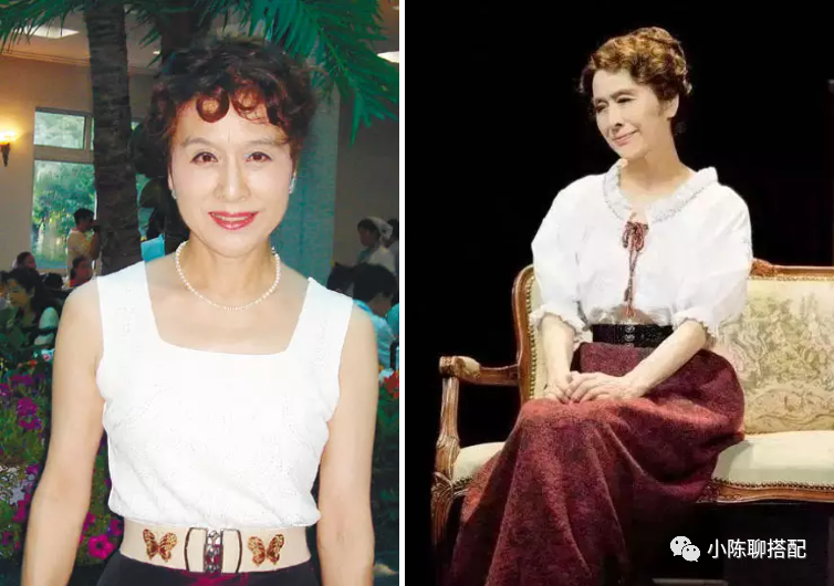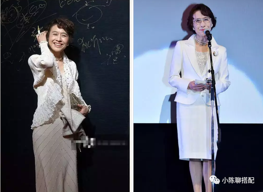 人至中年,似乎都爱穿点花,浪漫的碎花衫一直深受奶奶们的喜爱,像这张图中,两人皆是碎花衣搭半裙,小卷是黑色碎花外套,秦怡则是白色V领碎花衣,都诠释出了一股书卷气息。而为了避免花哨,碎花的底色以干净简约的颜色为主,比如黑白,在色彩搭配上,同色系则更为稳定。
