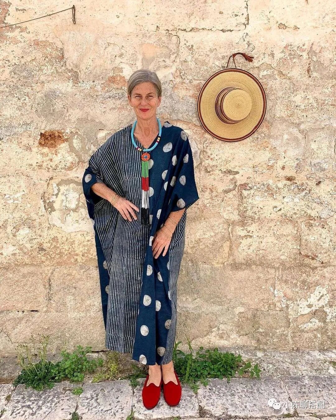 穿衣之高级在于简约,奶奶的裙装大多数都是比较简约的,图案简约,款式简约,即使有亮色,大多数也是纯色。而要把简约的服饰搭出时髦感,加入配饰也是一个选择,尤其是夸张一点的配饰,起到了视觉平衡的作用。