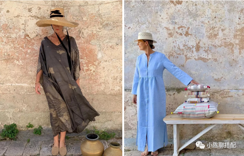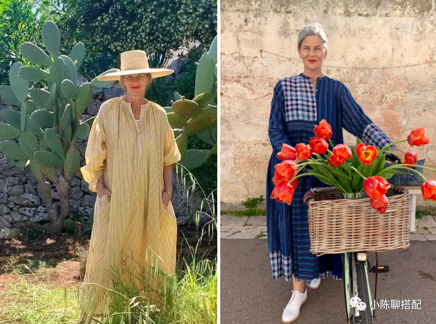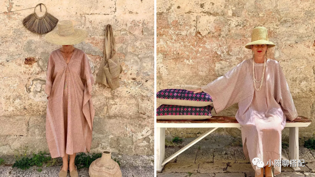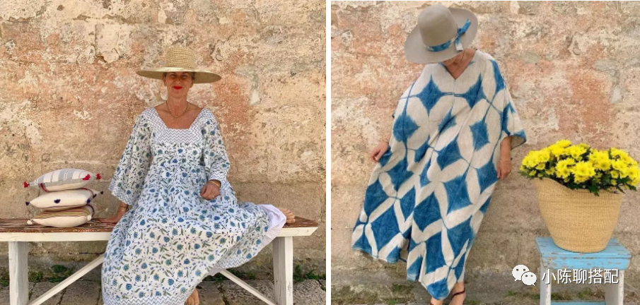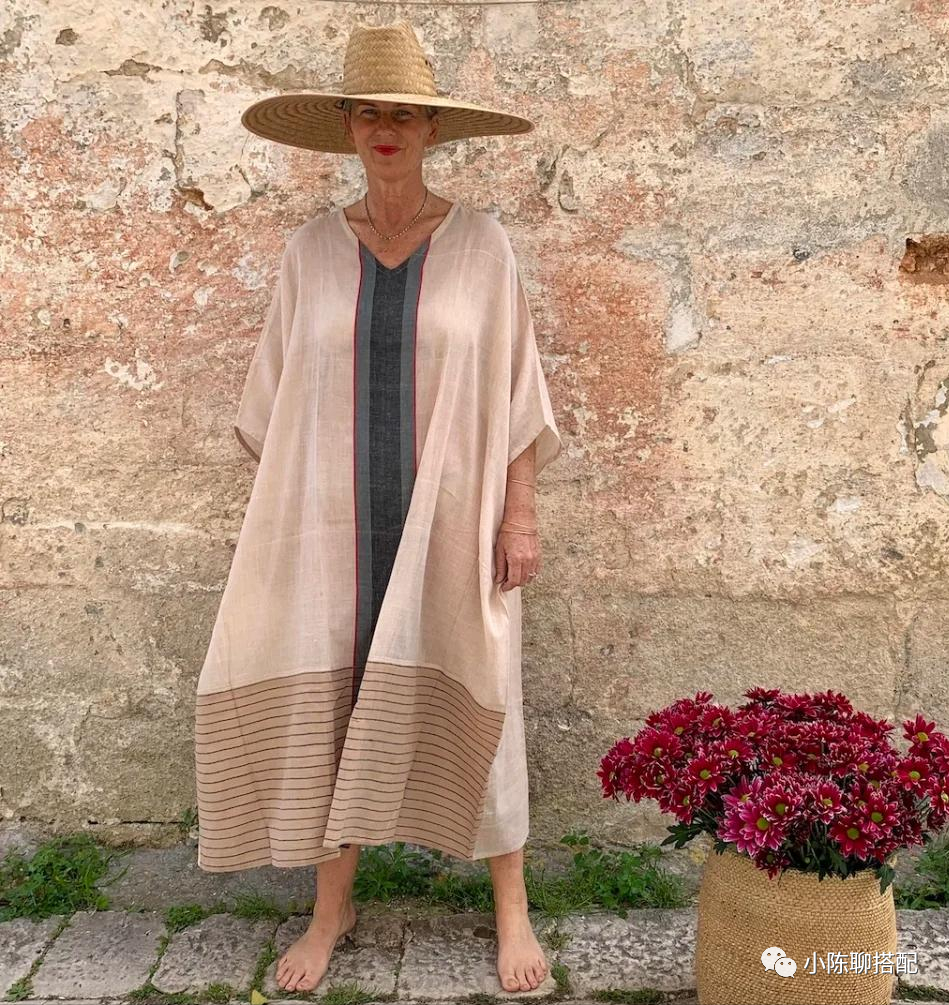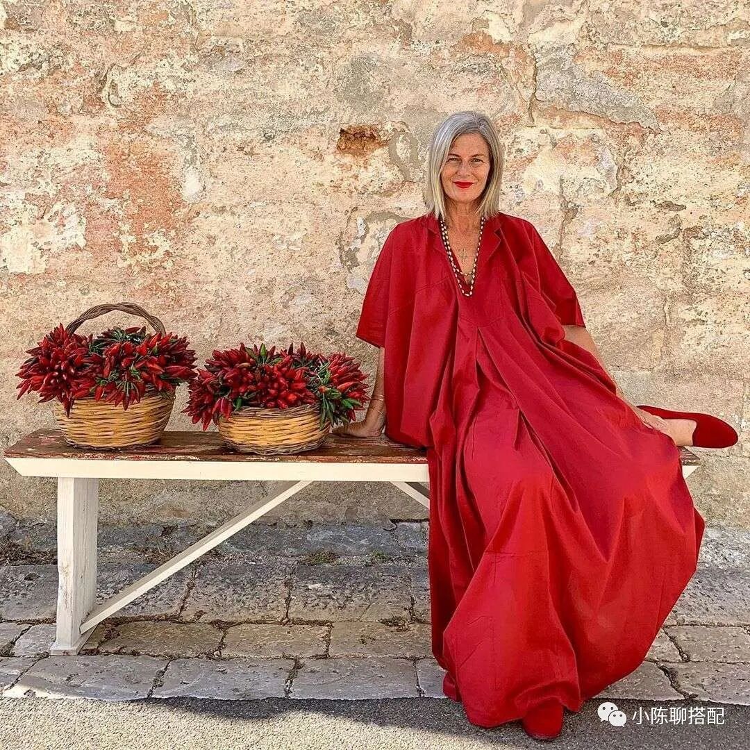 其实到了一定年纪,穿衣舒适更重要,奶奶深知这一点,她更喜欢版型宽松的一片式裙装,没有身形的限制,体现出一种舒适与自由。而宽松也并不意味着会显得拖沓,像硬挺的面料可以轻松撑出裙子的廓形感,比如棉质面料。又或者虽易变形但因皱褶而不会产生膨胀感的棉麻类,亚麻类面料。