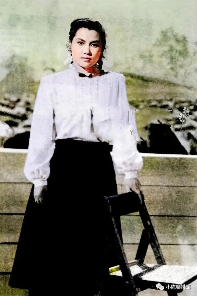 旗袍虽美,却是挑人,A字半裙能同时兼顾优雅与身形,相对而言对身材的包容性更高,像腿部比较粗短的女性可以多尝试,选择版型基础的高腰半裙,上半身搭配一件简约的白衬衣,于袖口和领口处展现时髦,比如灯笼袖和小翻领的设计,整体上是经典的黑白撞色,有与奥黛丽赫本相似的复古风,大家闺秀气质尽显。