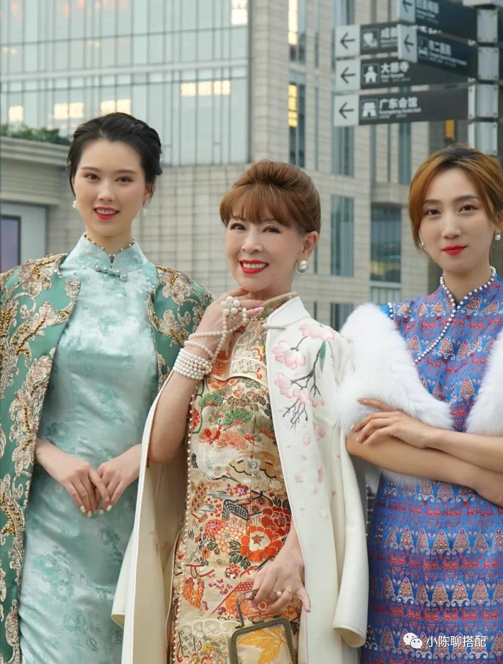 汪奶奶的这身旗袍颜色绣花偏艳,白色的底色削弱了颜色的冲击感,搭配珍珠耳环和礼帽,优雅又有活力,她以优雅的姿态站在那里,甚至我们看见的不完全是旗袍,而是旗袍下那张优雅美丽的面孔。▼