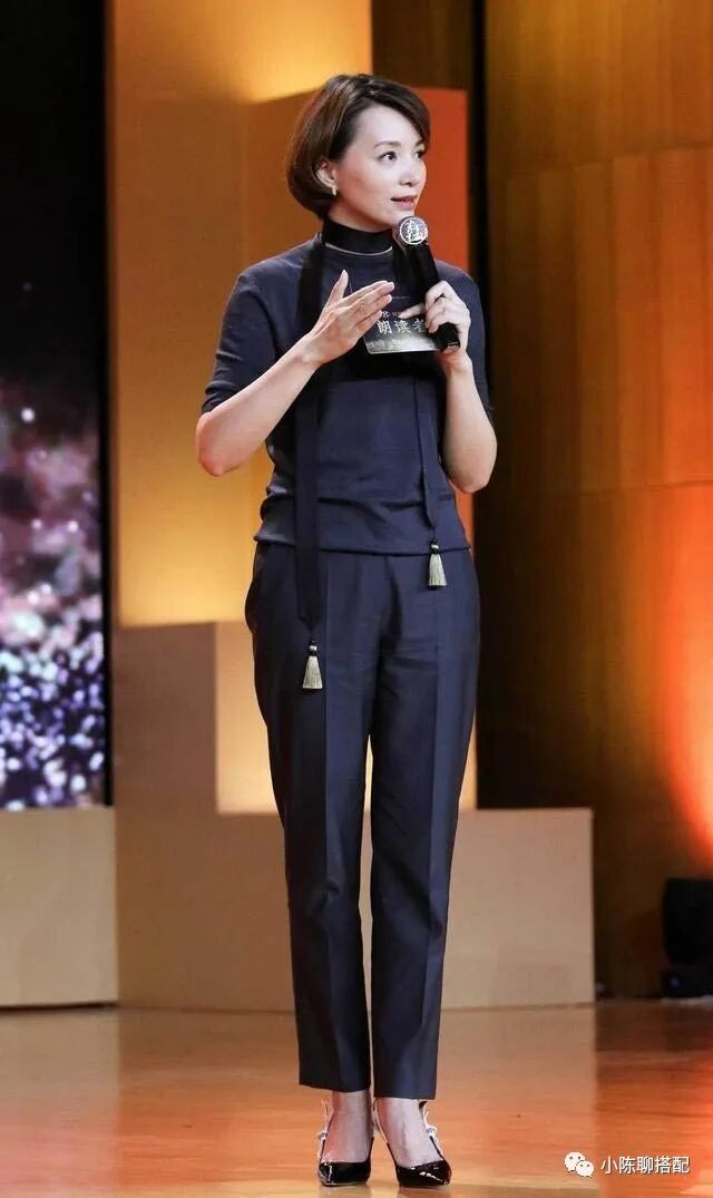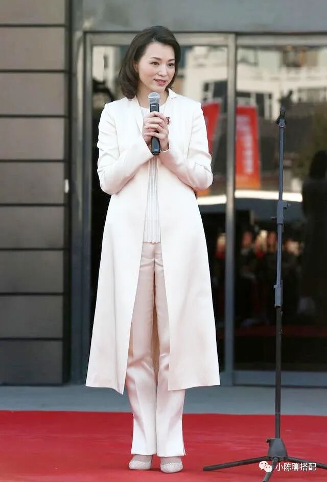 像董卿的这身穿搭,因为衣服已经自带收腰,且裙子本身就属于带有A字廓形,就算没有刻意去营造腰线,我们也可以看到腰很细,身材比例显得更加均匀。那么,不刻意营造腰线,但又要体现腰线,以下这几种方式也同样不错。