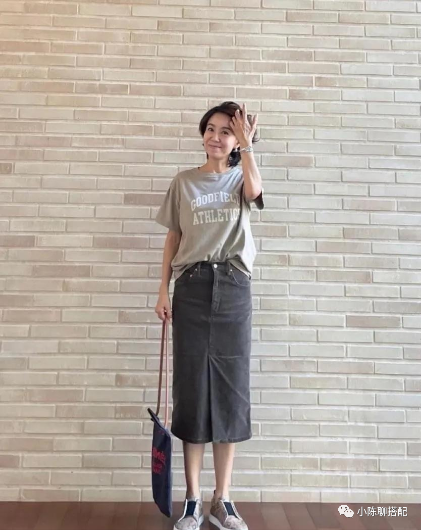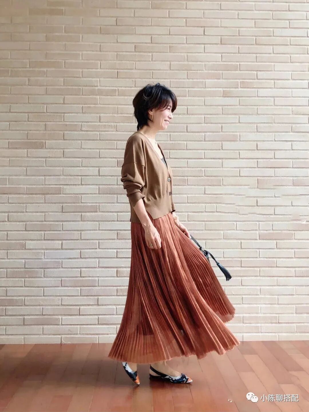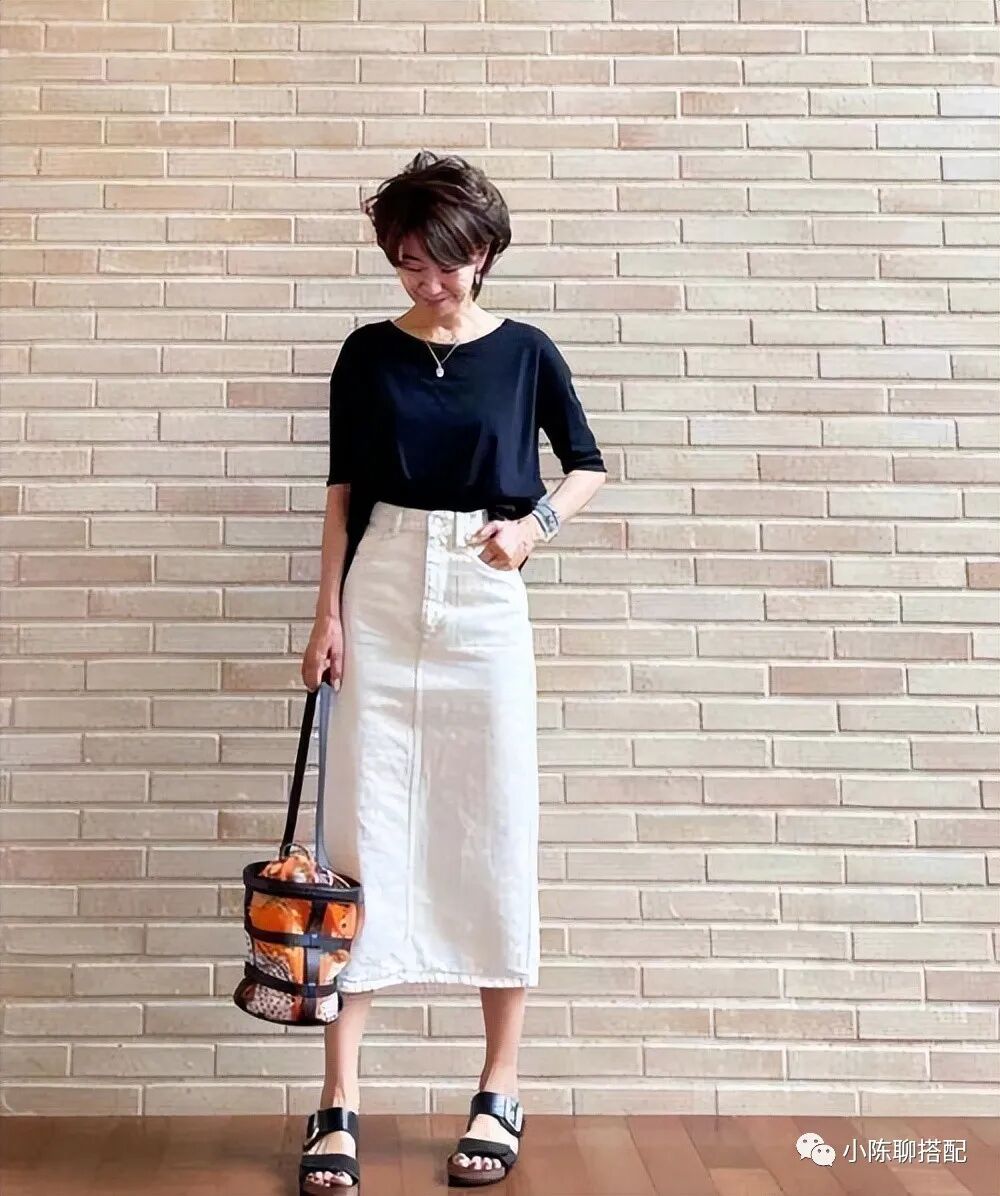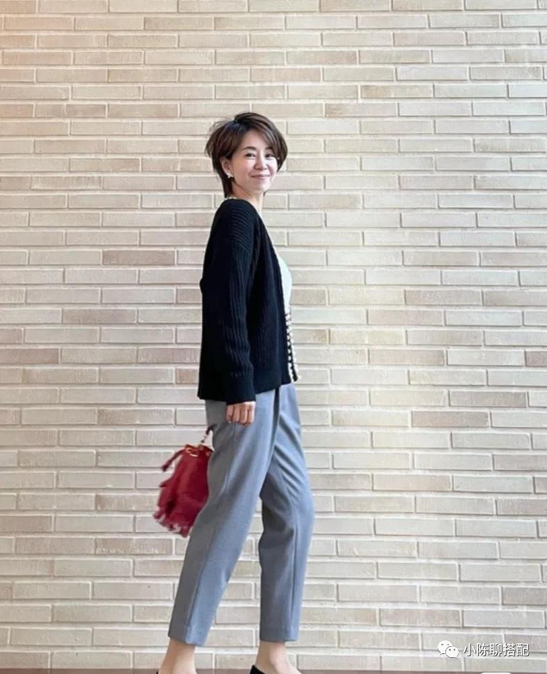 那中年女性具体应该怎么做呢?从这位日本主妇的穿搭中得到的:裙要过膝,裤要露踝,高级时髦。