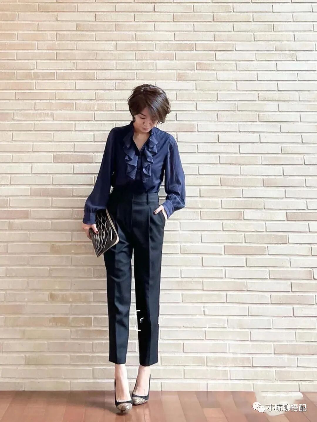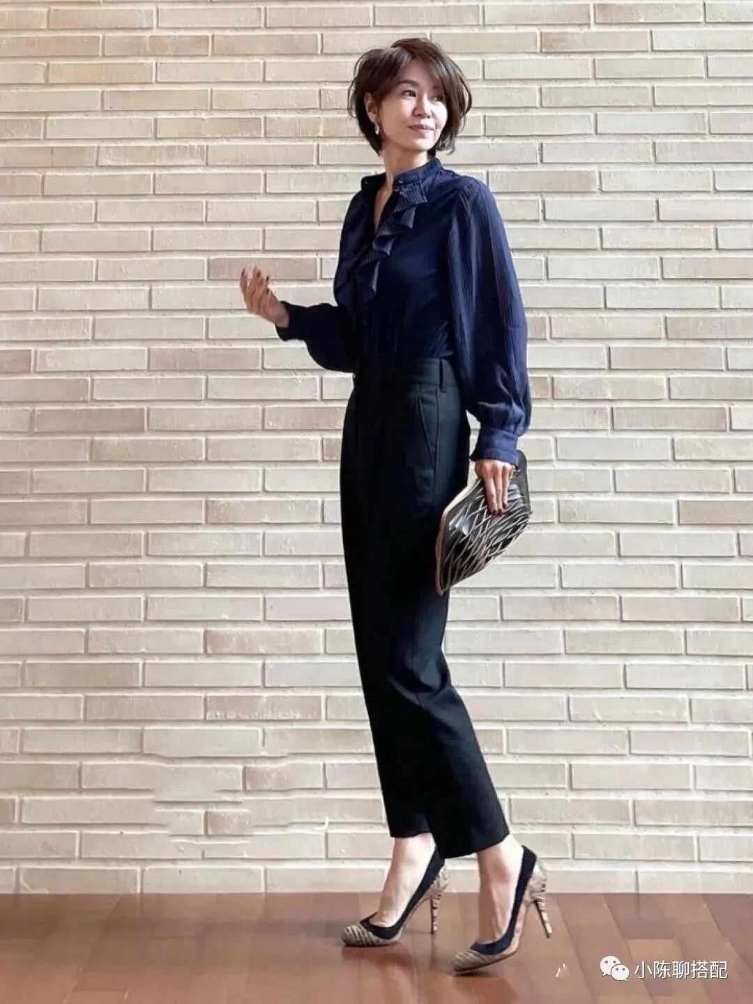 穿衣打扮,穿的就是一个精神面貌,中年女性穿衣还是得穿出廓形线条才显气色,而裤脚偏窄的九分裤正好体现了这点,比如西装裤,直筒版型的高腰西装裤,再搭配一双同色系的浅口尖头鞋,整个人都显高的许多。