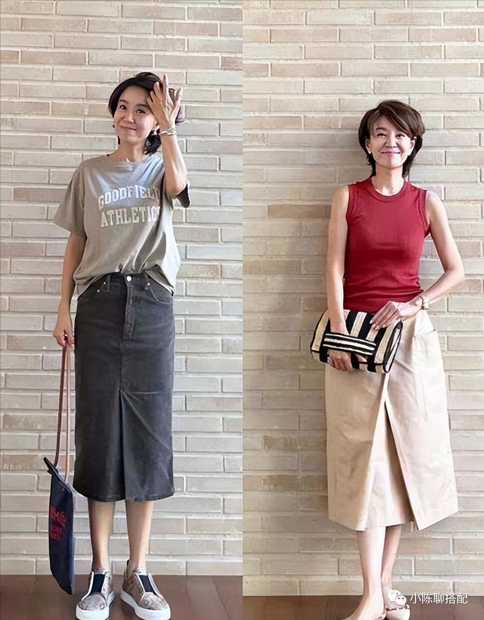 浅灰色T恤+深灰色牛仔裙,整体风格偏休闲,而同样是短衫+半裙,右图红色无袖衫搭配卡其色半裙更优雅,这有版型的原因,也有色彩的原因。